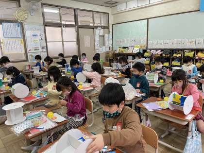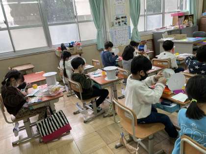 絵を描くだけでなく,折り紙を切って貼ることをがんばっています。