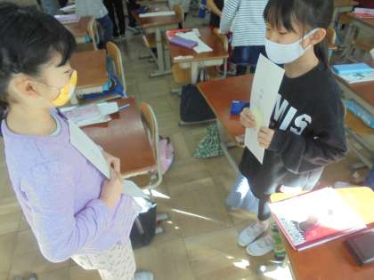 「いる」と「ある」の使い方に気をつけて,言葉が隠れている文を作る学習をしました。今日はその文を使って,みんなでクイズ大会をしました。たくさんのお友だちと交流する中で,同じクイズの人がいたり,隠れているものが2つあったりと,発見もあったようです。