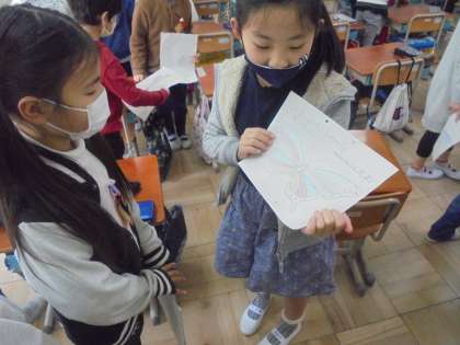 じぶんで色を付けたオリジナルちょうちょを紹介し合いました。自分がえらんだ色を英語で伝えたあと,お気に入りのところを日本語で伝えました。言えるようになった色の表現を使って,一生懸命伝えていました。お友だちとちょうちょを紹介し合って,とてもうれしそうでした。