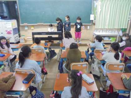 係活動では,休み時間に声をかけてクイズや演奏をしたり,ポスターを作ったりしています。今日は,休み時間に音楽係が演奏会をしていました。知っている曲では,聞いている人たちが自然と歌い始め,みんなで楽しんでいました。