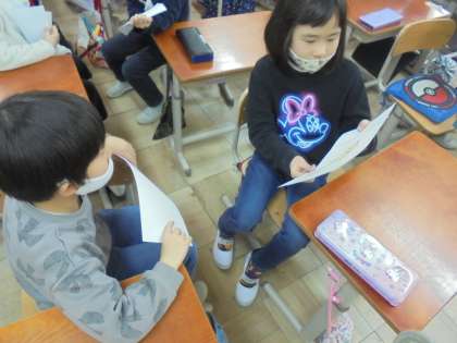 今回は,読んで感じたことをカードにまとめ,交流しました。違う場面を選んでいる人もがいたり,同じ場面を選んでいても,感じたことが違う人がいたりして,みんなそれぞれいいなということに気付きました。