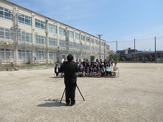 入学式では,在校生代表として,6年生が「お迎えの言葉」を発表しました。クラスごとに記念写真を撮影しました。青空の下,1年生の笑顔がきらきらしていました。