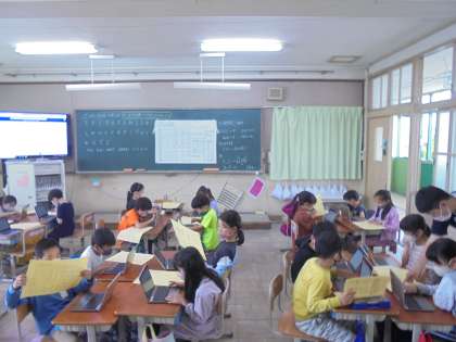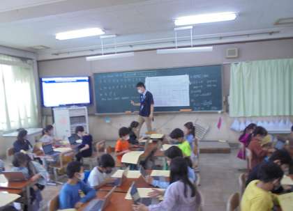 GIGA端末を使って,五十音のつく言葉をローマ字で打ち,共有しました。GIGA端末を使うと,同時にみんながどのような言葉を打っているかがわかりました。楽しみながらローマ字に慣れ親しんでいます。