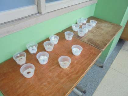 5年生の教室前には,一つの条件だけを変えて発芽の実験を行っている種子が並んで置いてあります。どの種子が発芽するのか様子を調べています。