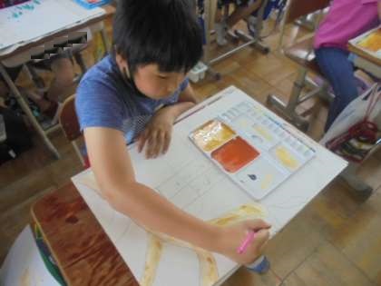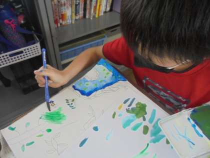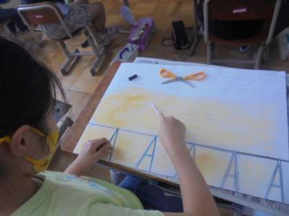 5年生は図工で心に残っている思い出の場所を絵に表しています。その場所の様子を表現しようと,色や塗り方にとてもこだわっています。