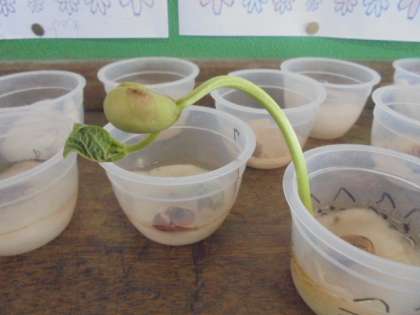 5年生はインゲン豆の発芽実験をしています。ついに芽が出てきました。そろそろ発芽にはどんな条件が必要何かわかってきそうです。