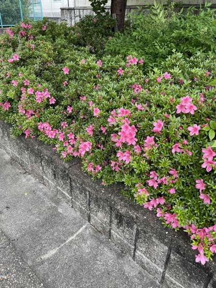 ツツジです。同じような時期に,同じような赤い花を咲かせるサツキという花もあります。ツツジの花は大きめで,サツキは小さめになります。サツキは,もう少し後の時期に咲きます。