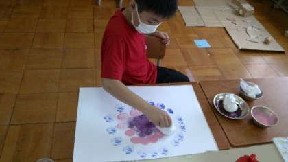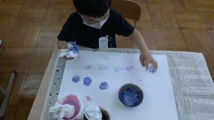 先日観察したフラワーロードのアジサイを,タンポを使って描きました。思い思いの素敵なアジサイになりました。