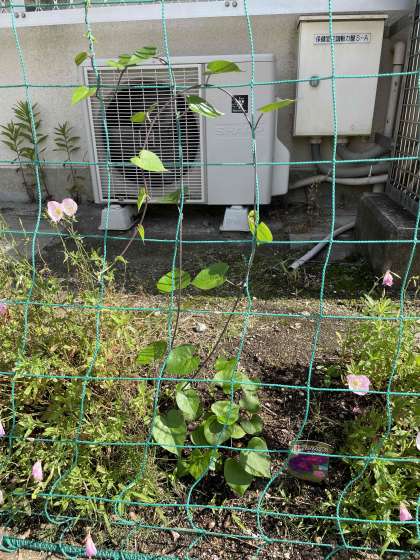まだ植えたばかりで,少しだけつるが伸びていますが,これからどんどん伸びます。