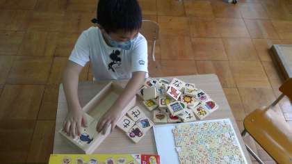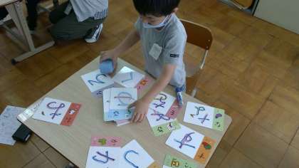 1年生は平仮名を学習しています。平仮名ブロックやカードなど,それぞれに合った方法で学んでいます。