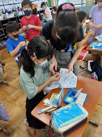 家庭科の授業で,裁縫の学習をしています。玉どめや玉結びの練習をしています。友達と教え合って少しずつできるようになってきています。家に帰って練習したり,中間休みに教室で練習したり,一所懸命取り組んでいます。