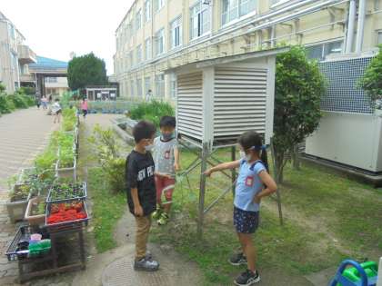 国語科で,自分たちの発見したものを伝えるために,学校の中を調べていました。百葉箱の横にひまわりが咲いているのを見つけている子どもたちもいました。