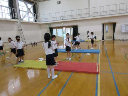 3年生になり,マットの学習も内容が変わりました。様々な技を工夫した場で練習して技の獲得を目指しました。友達と技カードを見ながらアドバイスをし合い,技のポイントを少しずつつかんでいきました。