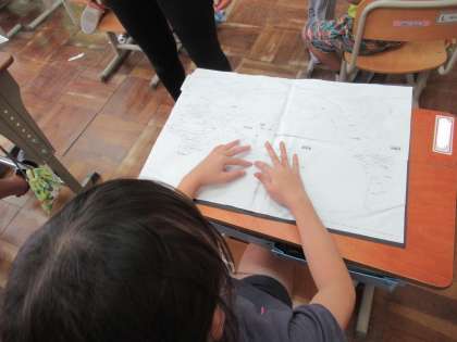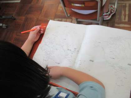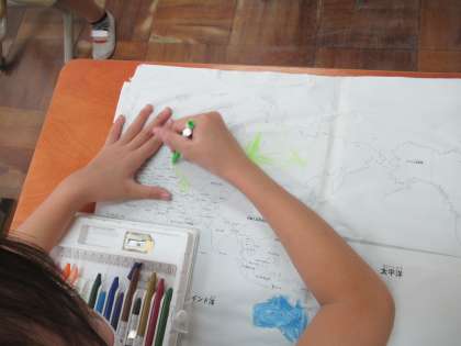 世界の国々について調べました。世界地図をつくりました。行きたい国や興味のある国に色をぬりました。