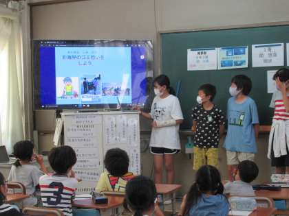 ときわぎタイムの発表は6年生でした。6年生は,調べて考えたこと,新たな提案をまとめて,1年生〜5年生に発表しました。ロイロノートにまとめ,ロイロノートのテキストをつなげ,パワーポイントのようにして使い,下級生にも言いたいことが伝わるように,工夫して発表しました。