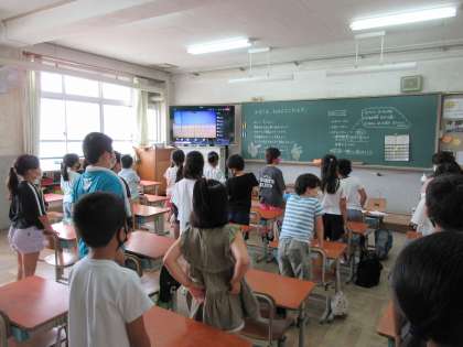 各教室からリモートで始業式を行いました。「式だから気持ちを引き締めていこう」と声をかけると,誰もしゃべらずに静かに話を聞いたり校歌清聴したりすることができました。