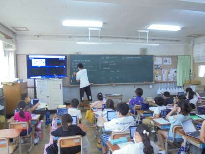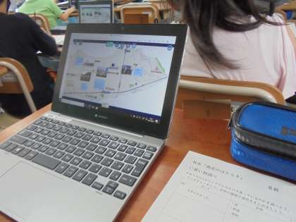 ロイロノートを使って,グループで校区の地図に気が付いたことを付箋で交流しました。そして,各グループで交流したことを全体で,画面に映し出して交流しました。