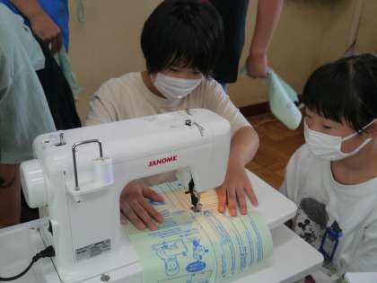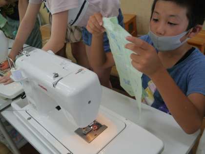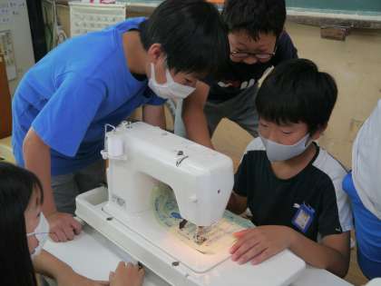 5年生ではナップザックづくりをします。まずは,ミシンの使い方を学習します。上糸と下糸の準備が難しいようで,何度も挑戦して頑張っていました。