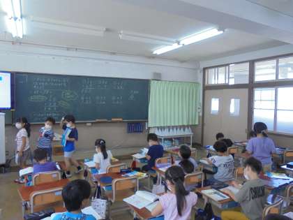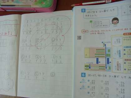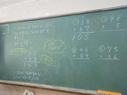 2つの位でくり上がりのあるひっさの仕方を学習しました。学習の最後には練習問題に取り組みました。