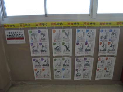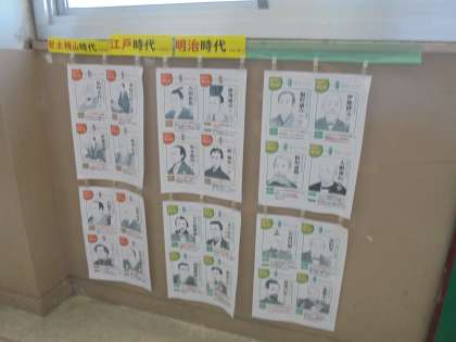 6年生の廊下には,学習するたくさんの歴史人物について掲示されています。