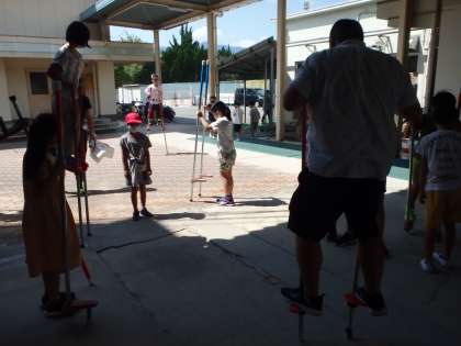 5年生の先生が竹馬をしてくれて,嬉しそうにしていました。