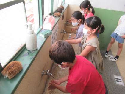 児童朝会での話を受けて,音楽の合図で,石けんを使った手洗いをしっかり頑張りました。