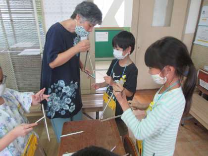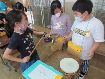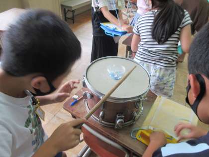 音と物体の振動の関係を見るために,楽器を使った実験をしました。音が大きいときと小さいときで震え方に違いがあるかをいろいろな楽器を使って確かめました。