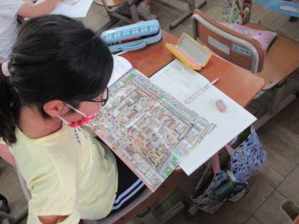 スーパーマーケットの店内図を見て,「お客さんに来てもらうためのくふう」について考えました。売り場の様子や従業員の人の動きからたくさんの工夫に気づくことができました。