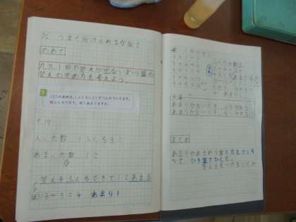 あまりのあるわり算について学習しました。うまく分けられないときにどのようにするかを考えることができました。