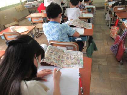 教科書の挿絵から,お店の工夫を予想しました。