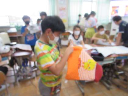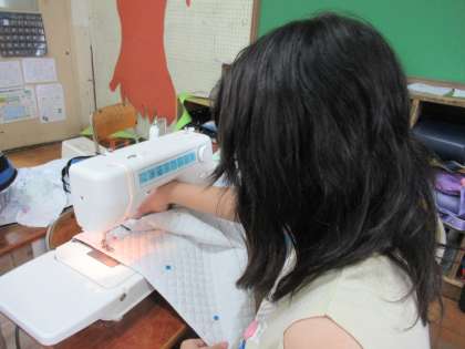 ミシンを使ったナップザックづくり。出来上がりに近づくと,とてもうれしそうです。ミシンの使い方を確かめながら,一生懸命つくっています。