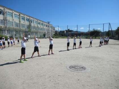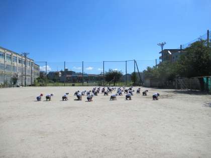 ダンスの立ち位置を確かめながら,音楽に合わせておどりました。元気よく手足を伸ばし,上手に踊れました。
