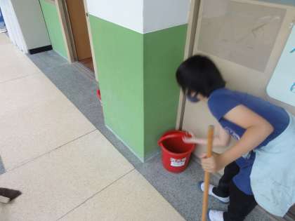 職員室前をほうきでしっかり床を掃いています。