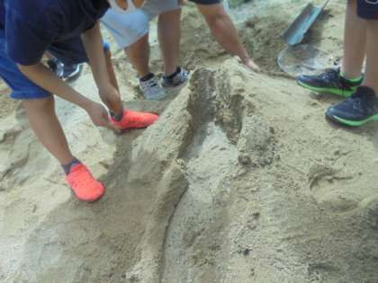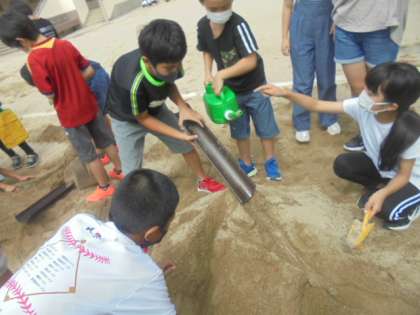 砂場に土山を作り,流れる水の量とそのはたらきの関係を調べる実験をしました。