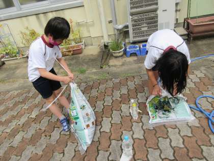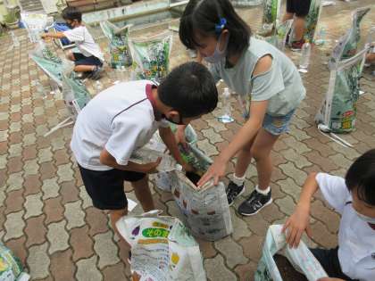 土袋の底を縛り,中の土に水を含ませて混ぜました。少しずつ大根を植える準備が整っていきます。