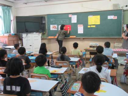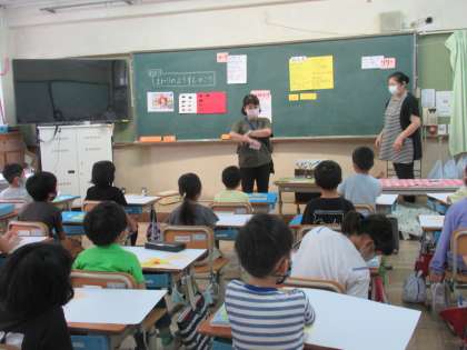 まわりのようすを想像して描く学習をしました。お話の主人公がつけているティアラの色は何色なのか,想像した色を画用紙に描くには,どうしたらよいか,教えてもらいました。パスの色を,重ねて塗るよさを知りました。