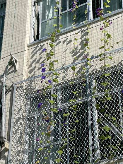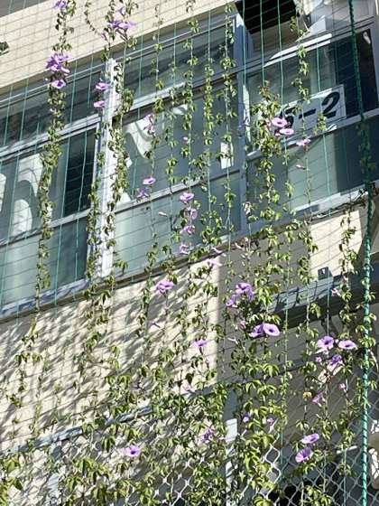 運動場側の校舎にグリーンカーテンがあります。今年は,アサガオを植えました。1年生が鉢で育てているアサガオは,もう花が咲いて,種を取ることができますが,グリーンカーテンのアサガオは,今,花を咲かせています。