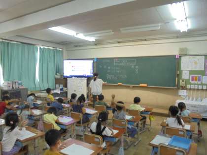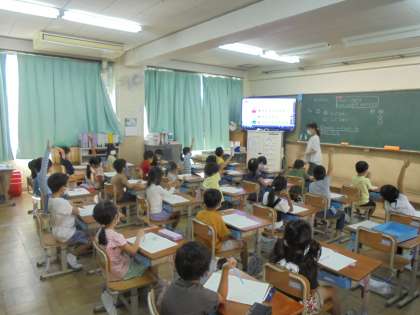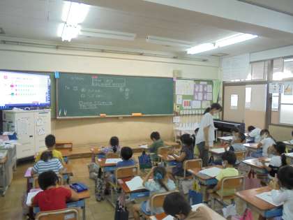 どちらが,どれだけ多くかさが入るのかについて学習をしました。基準の量を同じコップで比べて考えました。