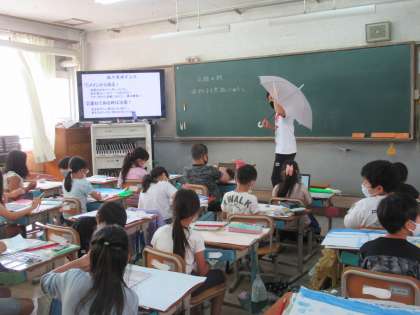 先生が主人公のモデルになって傘をさして場面の様子を示しました。子どもたちは,どのように傘をさしているか,傘がどのように見えるかを参考にして絵を描きました。