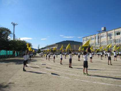 運動場でフラッグをもってみんなで練習しました。さすが6年生。とてもかっこいいです。