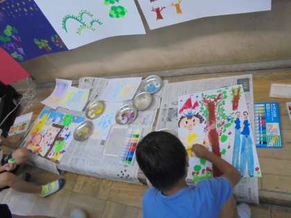 お話の絵の最後の仕上げに取り組んでいます。背景に絵具で色を付けました。