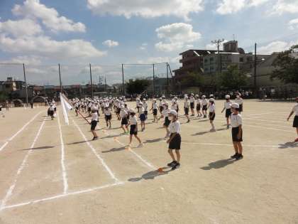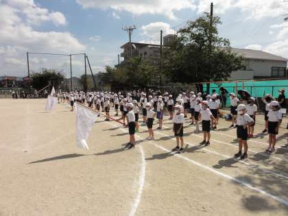 それぞれ,クラスで作った旗を掲げながら開会式を行いました。