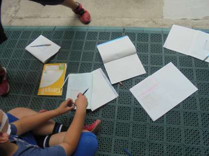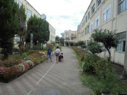 平均の学習で学んだことを生かして,中庭で実際に計測し,自分たちの歩幅を求めました。