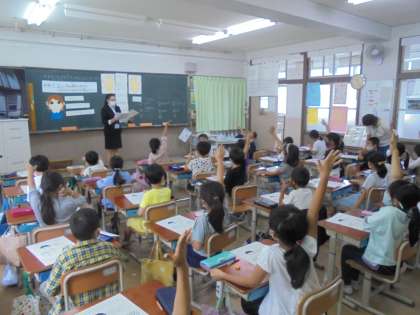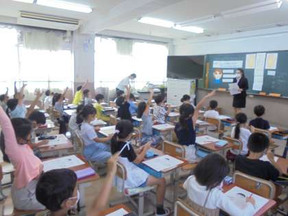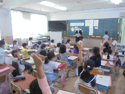 教育実習生による,正しい手の洗い方やマスクのつけ方の学習をしました。子どもたちは,たくさん手を挙げて発表していました。
