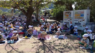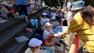 昼食時間になりました。少し日陰のあるところで,食べています。