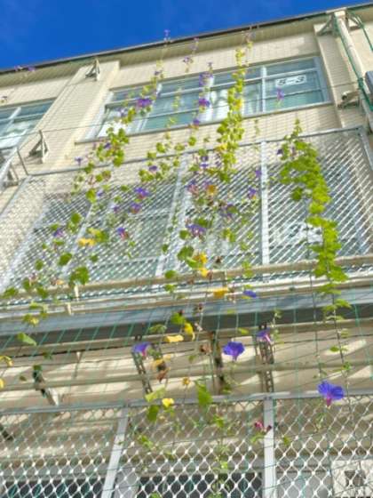 日よけにもなるし,教室からも花が見られていいですね。