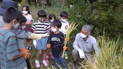 稲刈りをしました。初めてかまを持つ子が多かったですが,上手に扱かって,収穫することができました。