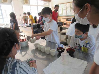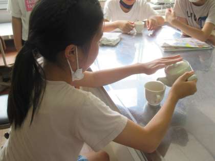 家庭でもお茶を入れて,家族の一員として行動できるように,学校でお茶を入れる活動をしました。緑茶とほうじ茶を入れました。温度に気をつけておいしく入れられました。