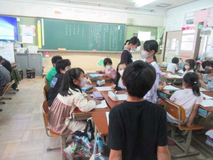 ときわぎタイムで1年生の発表を聞き,質問や感想を交流した後,たてわりグループで交流し,ひとりひとりが感想を話しました。たてわりグループで交流するときは,6年生のリーダーが中心になって下級生をまとめていました。