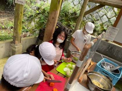玉ねぎを切って目がしみますが,がんばっています。かまどの係も火が付くようにがんばっています。